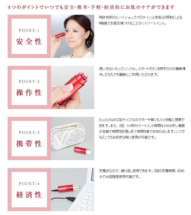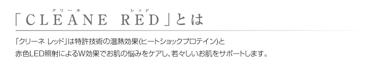 「クリーネ レッド《は特許技術の温熱効果(ヒートショックプロテイン)と赤色LED照射によるW効果でお肌の悩みをケアする製品です。