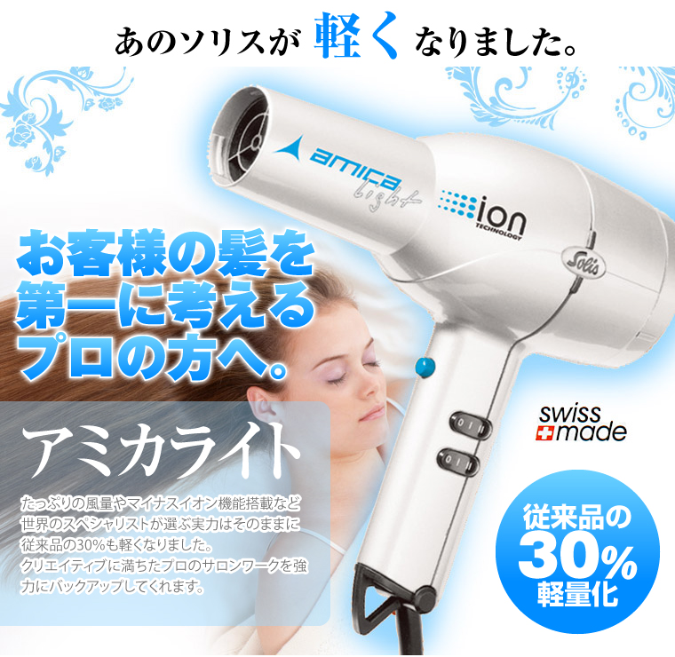 ヘアスタイリストなら誰もが知っているスイス製ソリス社のマイナスイオンドライヤー。ソリスのドライヤーは、圧倒的な風量で他社との差別化を図ります。なかでもこのアミカは、ソリス社最軽量のドライヤーです。