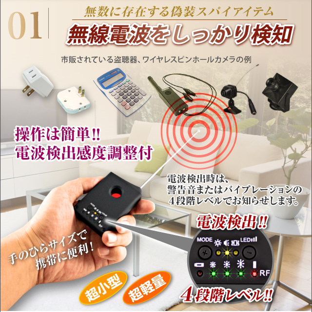 電波式・光学式対応の実用的、盗聴・盗撮発見器!