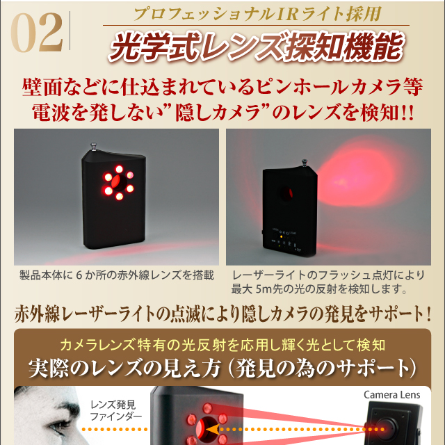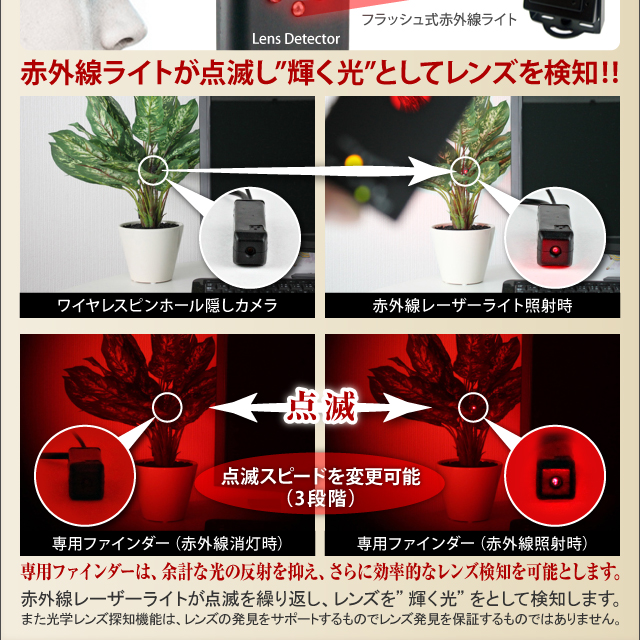 本体付属の赤外線レーザー探知機能で、隠された小型カメラ発見をサポートします。
