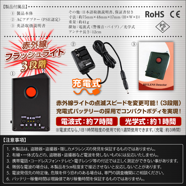 1.本製品は、盗聴器・盗撮器・隠しカメラレンズの発見を保証するものではありません。