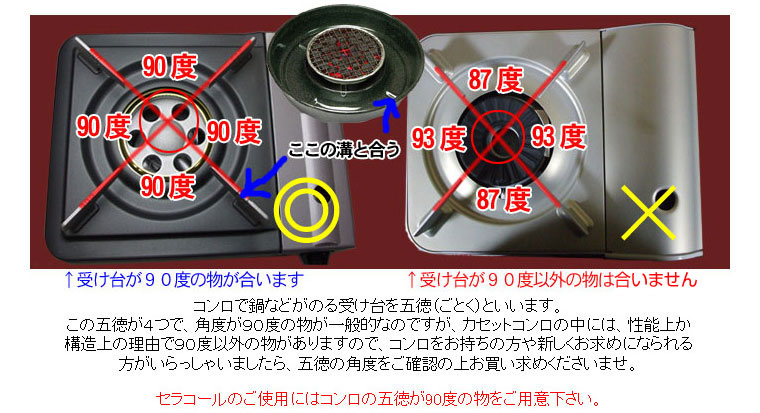 セラコールのご使用にはコンロの五徳が90度の物をご用意下さい。